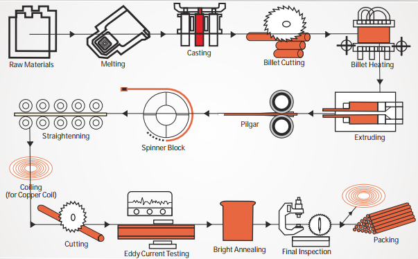 These billest are pre-heated to proper extursion temperature and extruded into mother Tube/ Road/ Section undergo pickling if required. Then undergo pointing, cold drawing and if required intermediate anneling. The Tubes, Road, Section are straightened. Tubes undergo Eddy current testing/ Hydrostatic testing. The product undergo annealing if customer require them in soft temper or draw further if required Half hard/Hrad Temper. The finished products undergo visual check, Dimensional check, Flaring, Flattening test, physical properties, and grain size test are also carried out before packing and despatch.